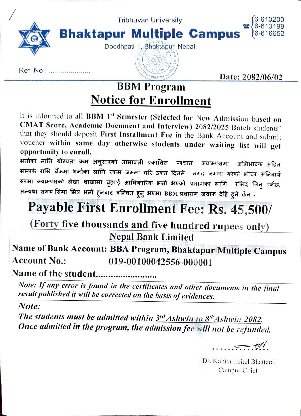 BBM Admission notice 2082